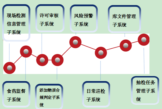 系統功能:現場檢測信息管理子系統、食藥監督子系統、許可審核子系統、日常巡檢子系統、風險預警子系統、添加物質合規判定子系統、庫文件管理子系統、抽檢任務管理子系統等八大版塊內容主體。
