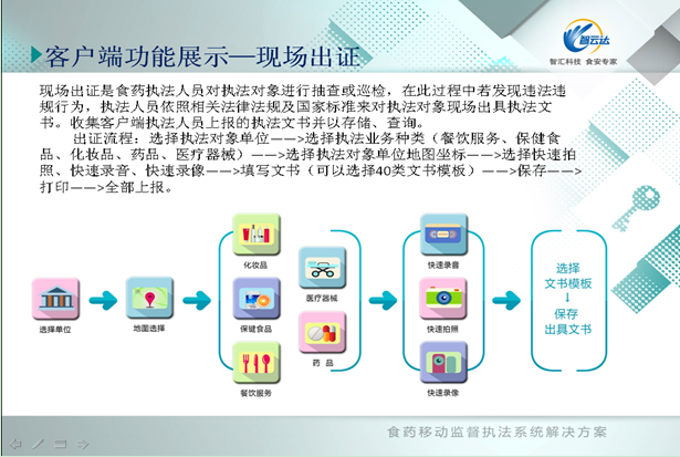 食藥移動監督執法系統是食品藥品監督管理領域移動監督執法綜合服務系統,主要用于食品藥品監督管理部門移動監管執法使用。執法人員可以手持客戶端現場檢測,錄像、錄音拍照等證據獲取,并依照法律法規對監管對象進行動態出證、等級評審、許可審核和日常巡檢等業務工作處理,并上報處理結果數據。監管人員根據執法采集的數據,及系統自動收集到的輿情信息,實現了食藥監管部門對所轄區內的食品安全問題重點監管工作。