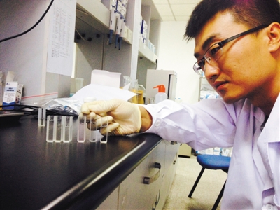 隨后實驗人員檢測泡椒鳳爪是否加入了超標(biāo)的防腐劑山梨酸。稱取5克樣品,加蒸餾水,搗成勻漿過濾,吸取2ml溶液到比色管中,加山梨酸試劑,沸水加熱后冷卻,再倒入比色皿中。此時6種樣品液的顏色有了不同,5種樣品顏色沒變,1種樣品液的顏色呈現(xiàn)出淺粉色。