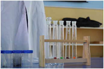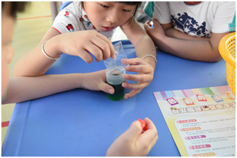 實(shí)驗(yàn)課的開頭,林老師拿出提前準(zhǔn)備好的試管,里面加了兩個(gè)神秘的糖豆,讓小朋友在試管中加入水,搖晃幾下,只見水的顏色也從原來的透明變成了糖豆的顏色,小盆友們都瞪大了眼睛并且看的津津有味,還不時(shí)露出驚訝的表情。