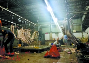 天氣漸冷,火鍋又熱,羊肉再走俏。然而,從屠宰場里出來、打著檢驗檢疫合格標志的羊肉,是不是就一定可以放心食用呢?昨天凌晨,記者暗訪發現,在橋頭鎮盛景禽畜市場內的屠宰場,動物檢驗檢疫形同虛設。
