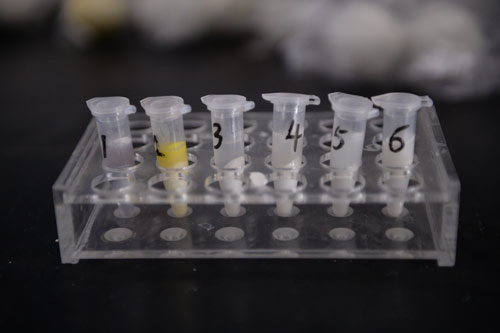 北京智云達技術(shù)工程師楊老師和王老師首先將樣品粉碎,通過使用北京智云達自主研發(fā)生產(chǎn)的快速檢測產(chǎn)品:黃曲霉毒素B1膠體金檢測卡,對樣品溶液進行檢測。