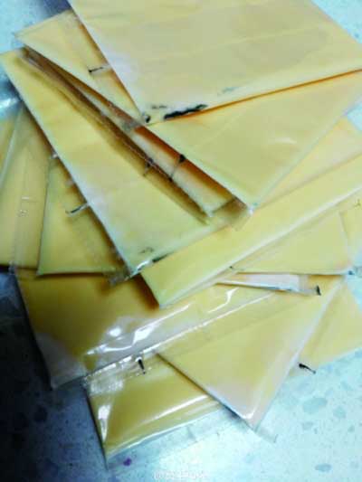 “正月初三的時(shí)候,我在超市內(nèi)購(gòu)買(mǎi)三元芝士片,正好趕上超市有活動(dòng),買(mǎi)兩袋贈(zèng)送了一袋。”果女士稱,將商品拿回家之后,她就將芝士片放在了冰箱里,一直沒(méi)有拿出來(lái)。“冰箱一直沒(méi)有斷電,都是正常制冷的。”她稱,直到昨天,她從冰箱內(nèi)將芝士片拿出來(lái)準(zhǔn)備食用,卻發(fā)現(xiàn)一個(gè)袋子中的芝士片已經(jīng)發(fā)霉了。“發(fā)霉的芝士片是贈(zèng)送的那一袋,里面的每一片都有一片綠色霉點(diǎn)。其他兩袋是正常的,沒(méi)有壞。我觀察霉變的芝士片上都有一道黑線,黑線的一側(cè)都有霉菌,要是我不小心吃到肚子里,肯定是要鬧肚子的。”