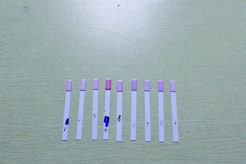 9種樣品取樣檢測(cè)后,檢測(cè)試紙顏色基本未變,也未呈現(xiàn)藍(lán)紫色。
