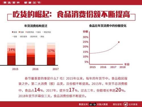 據(jù)科信食品與營(yíng)養(yǎng)信息交流中心副主任鐘凱介紹,2015-2018天貓年貨節(jié)大數(shù)據(jù)顯示,食品一直是服裝之外,年貨節(jié)消費(fèi)的第二大品類,且消費(fèi)額占比不斷提升;公眾在線采購的食物種類,也日趨多樣化。