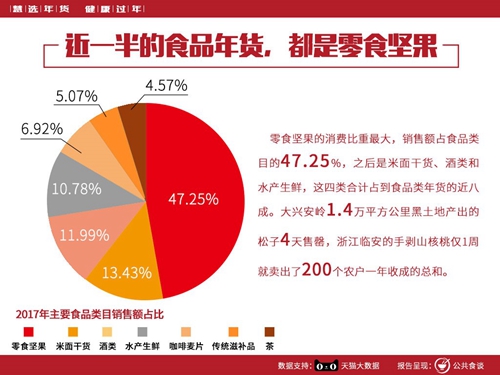 大數(shù)據(jù)顯示,在食品類的年貨消費(fèi)上,零食堅(jiān)果消費(fèi)量最大,占比高達(dá)47.25%。也就是說,現(xiàn)代人買年貨,在吃方面,近一半的錢花在以各色堅(jiān)果為代表的零食上。