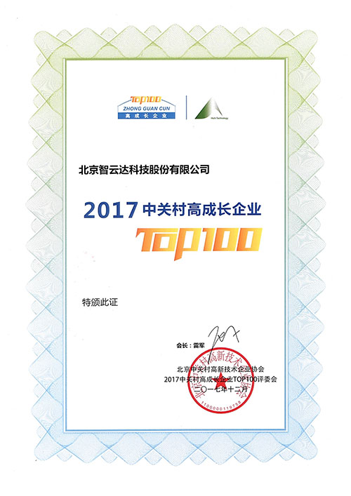 2017年12月在26日在北京友誼賓館舉辦了“2017中關(guān)村高成長(zhǎng)企業(yè)TOP100”頒獎(jiǎng)典禮。
