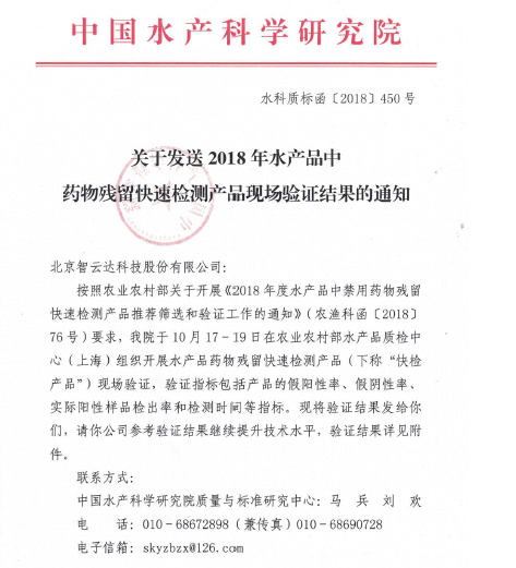 這次智云達驗證的快檢產(chǎn)品呋喃四項、氯霉素、孔雀石綠膠體金檢測卡的檢測限分別為0.5 ng/g、0.1 ng/g和2 ng/g,符合國內(nèi)市場及國家食藥總局KJ的標(biāo)準(zhǔn)要求,可為水產(chǎn)品質(zhì)量安全的監(jiān)管和檢測提供有效的檢測手段。