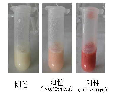 若反應溶液變紅,可判定樣品中含有磺胺類物質(zhì),為陽性(+);否則判為陰性(-)。