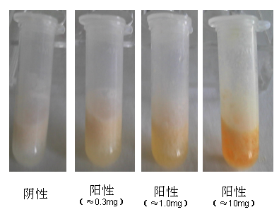 若反應溶液出現(xiàn)橙黃色、橙紅色,可判定樣品中含有喹諾酮類物質,為陽性(+);否則判為陰性(-)