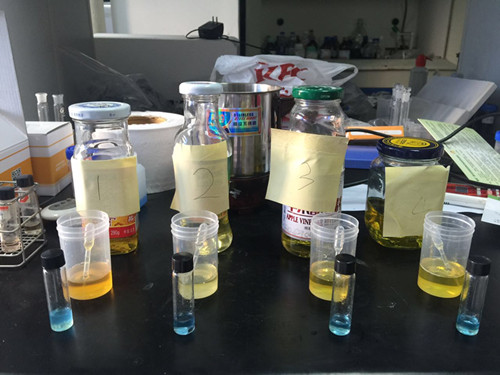 結果判斷:如溶液顯淺黃色,說明油樣酸價≥8mgKOH/g,酸價指標為陽性;溶液顯藍色、淺藍色或綠色,酸價指標為陰性。溶液出現混濁,水分指標為陽性;溶液澄清透明,水分指標為陰性。