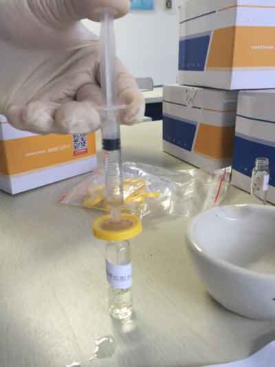 拔下注射器活塞(及針頭),接上過濾器,將A瓶上清液倒入針筒內,裝入活塞擠壓,收集全部濾液于試劑B瓶中。