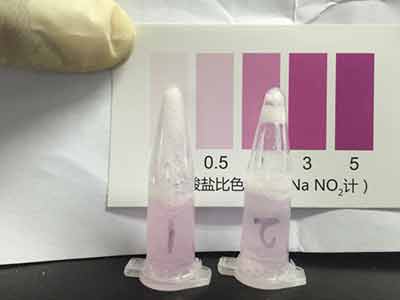 加入2滴試劑1,搖勻后靜置5分鐘。加入2滴試劑2搖勻靜置10分鐘后與標(biāo)準(zhǔn)比色卡對比,該比色卡上的數(shù)值即為樣品中亞硝酸鹽的含量mg/kg(以NaNO2計)。